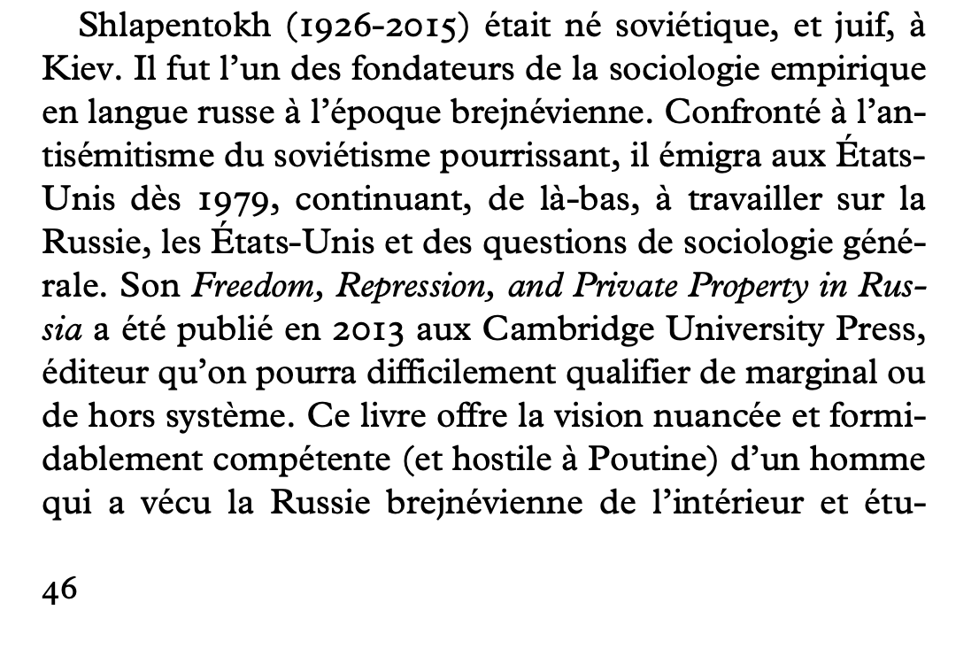 Il faut reconnaître son erreur quand on en fait une. Todd mentionne effectivement un livre de Shlapentokh dans son texte. (Mais pas de renvoi en note de bas de page, d'où mon oubli - merci @gallimard pour ce travail peu soigneux). Ça nous fait donc 2 sources universitaires. 1/6