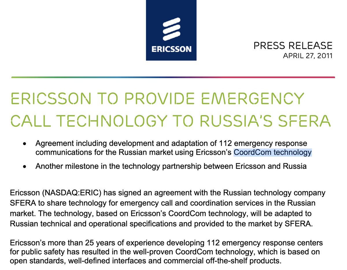 Ericsson är en leverantör av kommunikationsteknik och tjänster. Företaget möjliggör för Networked Society med effektiva realtidslösningar som gör det möjligt för människor att studera, arbeta och leva mer fritt i hållbara samhällen runt om i världen. Ericssons erbjudande omfattar tjänster, mjukvara och infrastruktur inom informations- och kommunikationsteknologi för telekomoperatörer och andra industrier. CoordCom, en funktionsrik kommando- och kontrollapplikation, låter räddningstjänsten effektivt ta emot, analysera och skicka nödsamtal från allmänheten som behöver hjälp av polis, brand och räddningsinsatser.