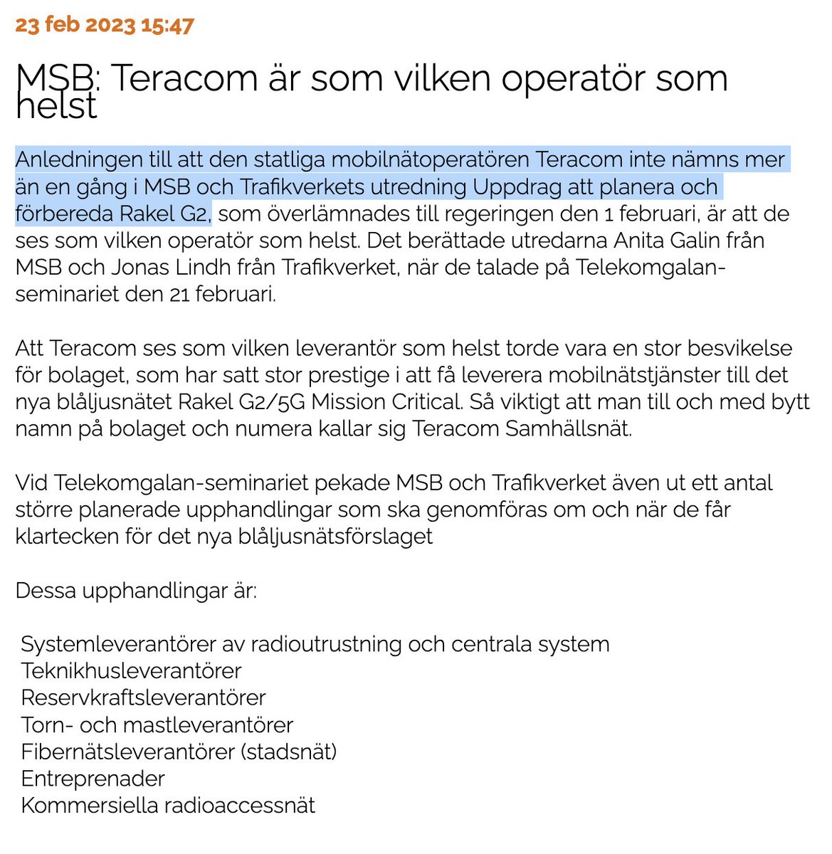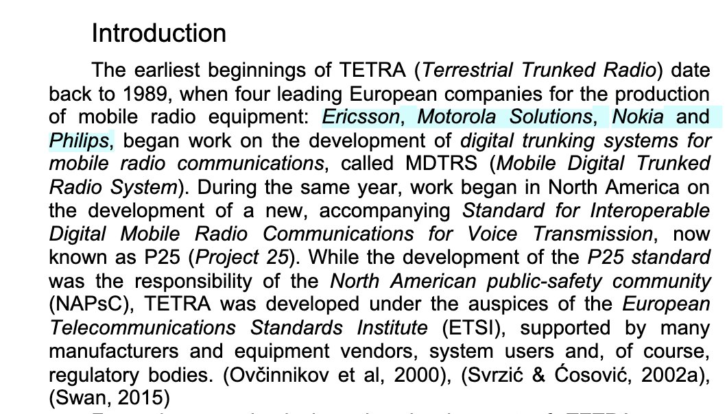 Nokias Tetrasystem hos polisen i Finland. I dag blev Nokias försäljning av sitt affärsområde för professionell radio PRM till EADS slutligt klar. I affären ingår Nokias kontrakt inom kommunikationstekniken Tetra, som favoriseras av polismyndigheter och räddningstjänst över hela världen. Även de svenska blåljusmyndigheterna valde Tetratekniken, som offererades av ett konsortium bestående av Saab, Nokia och Eltel Networks. nyteknik.se/nyheter/europe…