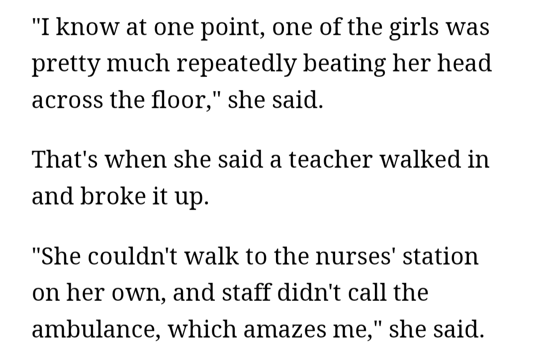 Dagny Benedict couldn't walk yet the school didn't call authorities or ambulance. A teacher reportedly broke up Dagny Benedict getting beat.