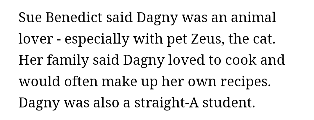 Sue Benedict said Dagny was an animal lover - especially with pet Zeus, the cat. Her family said Dagny loved to cook and would often make up her own recipes. Dagny was also a straight-A student.