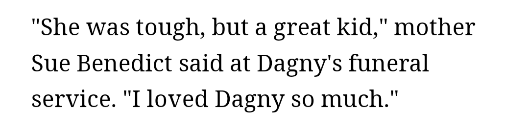 "She was tough, but a great kid," mother Sue Benedict said at Dagny's funeral service. "I loved Dagny so much."