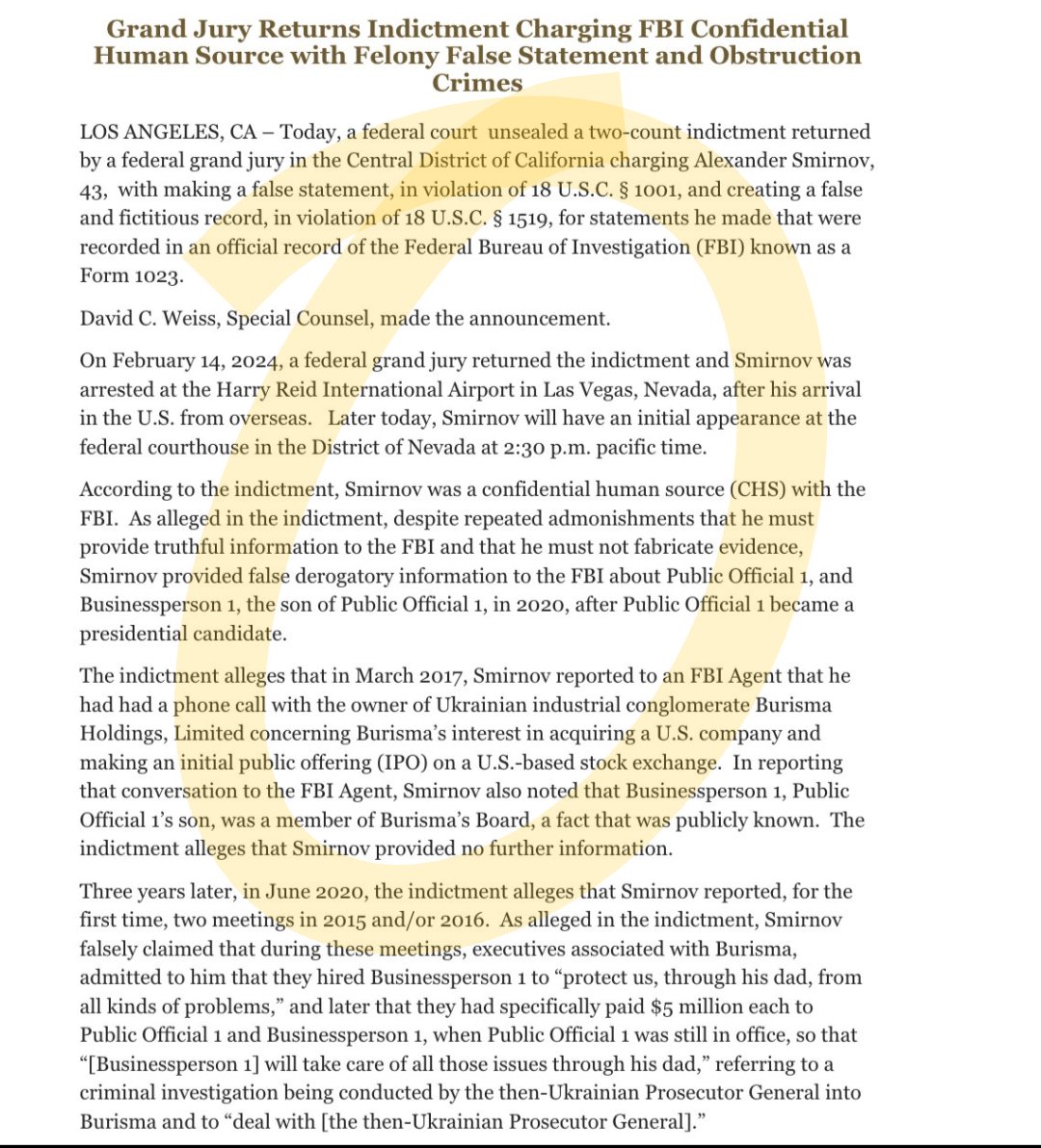 🚨 #BREAKINGNEWS HOLY SMOKES The Department of Justice has just indicted Smirnov for obstruction, and making false statements regarding President Biden, and Hunter Biden.and Obstruction.