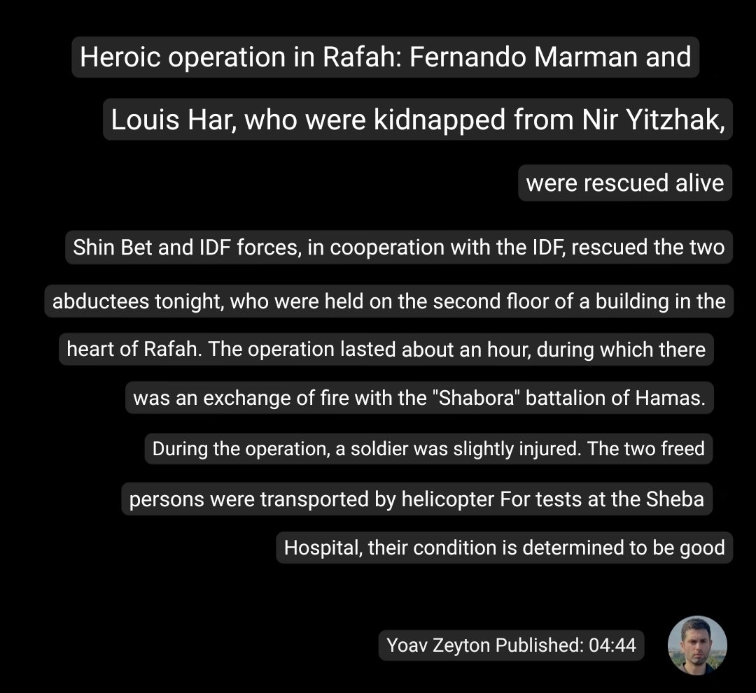 Two rescued hostages in almost 4 months of incursion is not very impressive, & still this fits right into the action movie fairytales Netanyahu & Gantz are trying to sell the Israeli public. Bibi & the security establishment already didn't want a deal and this is gold for them.