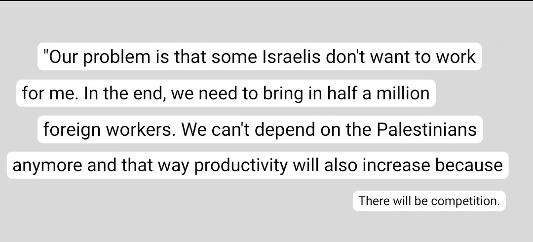 🧵Rami Levi, owner of the third largest supermarket chain in Israel, who has branches in illegal West Bank settlements where he employs local Palestinians as cheap labor, said today in a conference he "would like to replace all Arab workers with Israelis but this is the reality "