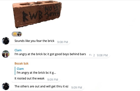 Following the arrest of the Pensacola members, the group adopted the hate-inscribed brick as their totem of action. /12