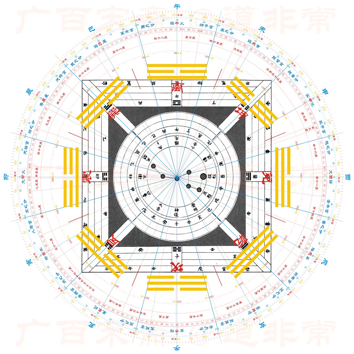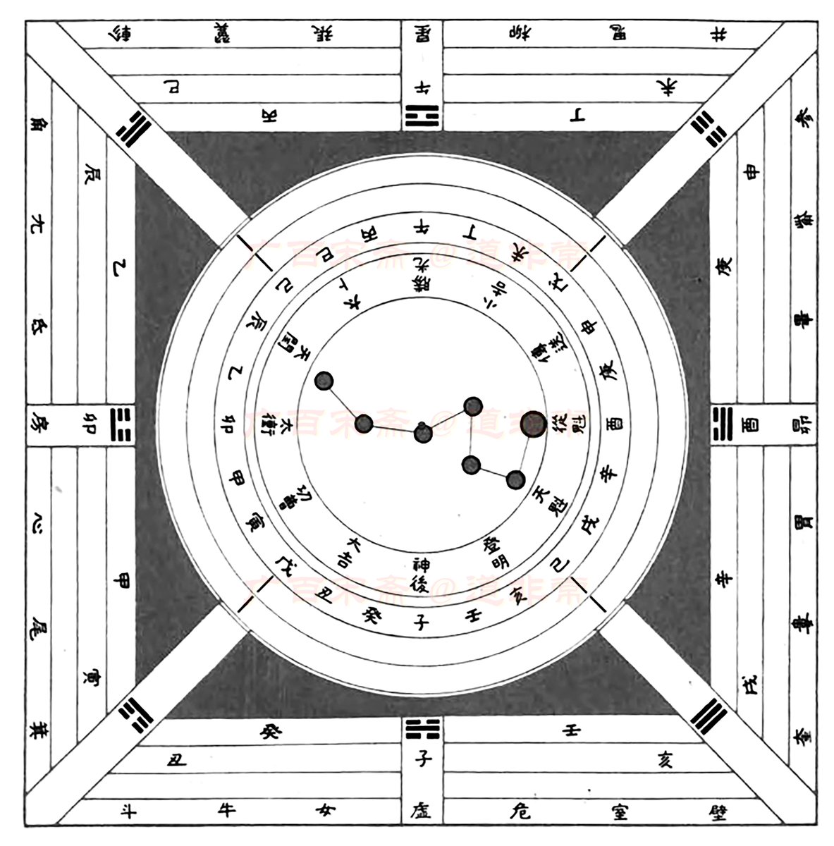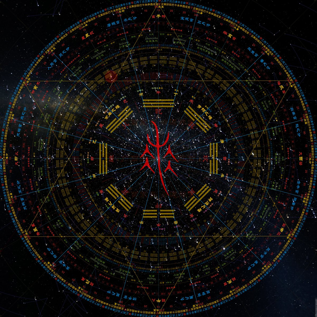 将文明历元、公元前118258年12月8日子正日落、冬至交节的北天星图逆时针偏转90°,我们就看到了基于“先天八卦图”的复杂、精细的黄道坐标图。