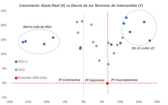2.1/4 La figura contiene la variación del gasto primario real (eje X) y el desvío de los términos de intercambio (TDI) respecto a su promedio histórico (eje Y). Al igual que en 2012, el fisco se montó sobre el shock de TDI para gastar más, cumpliendo al mismo tiempo con el FMI.