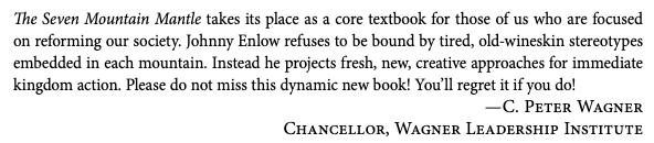 Johnny Enlow's book The Seven Mountains Prophecy (2008) was the 1st book that explicitly used the Seven Mountains frame.