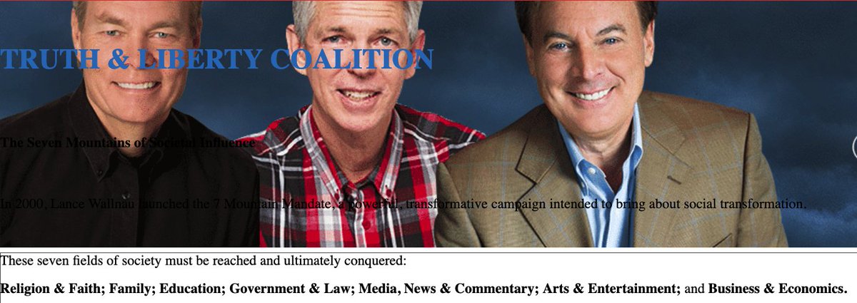 As I showed in Charismatic Revival Fury, ep. 3, the Seven Mountain Mandate is a charismatic (e.g., rooted in modern prophecy & miracles) program intent upon achieving Christian supremacy. It originated in 2000 with NAR prophet/apostle Lance Wallnau. 2/