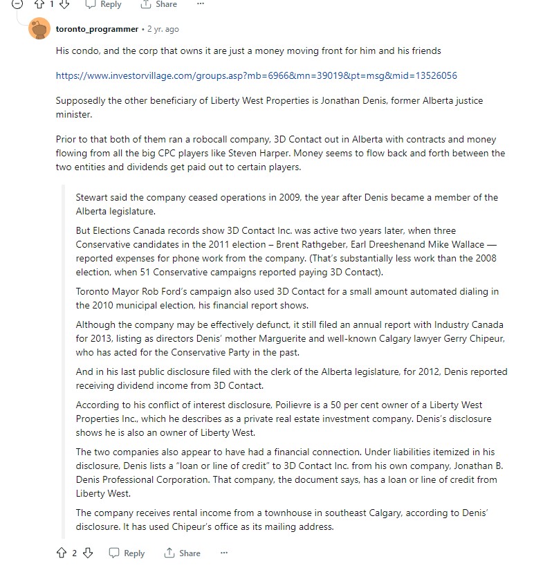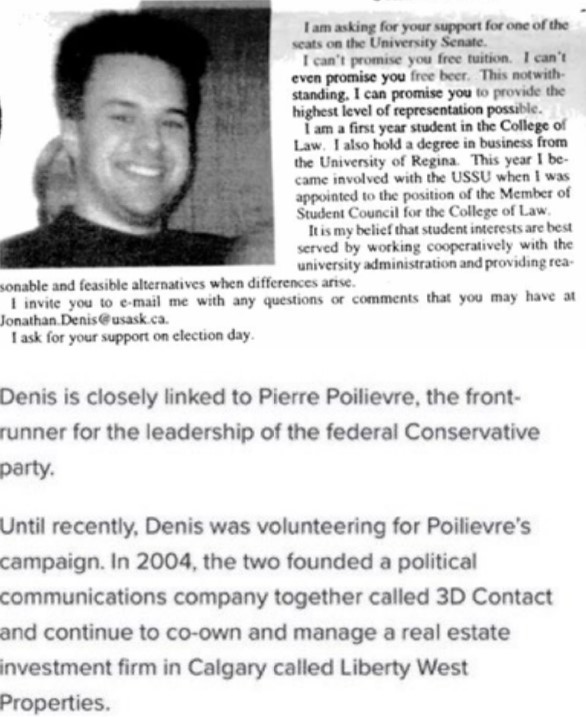 Denis and Poilievre are old friends and business partners. 20 Years ago, they co-founded 3D Contact Inc. and they continue to co-own a real estate investment firm in Calgary called Liberty West Properties. calgary.ctvnews.ca/blood-sport-ob…