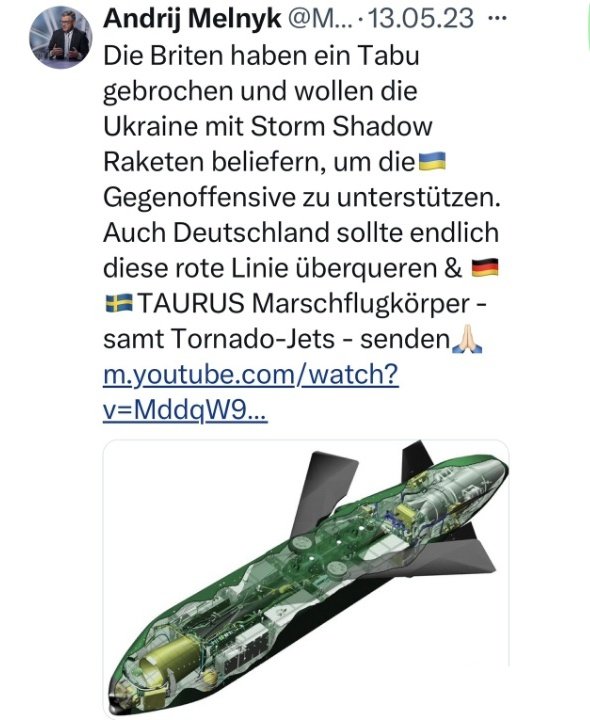 Mitte Mai/23 @MelnykAndrij bringt, nach eigenen Angaben, #Taurus als erster in den Diskurs. Anschließend argumentiert auch @RKiesewetter für den 🇩🇪MFK.
