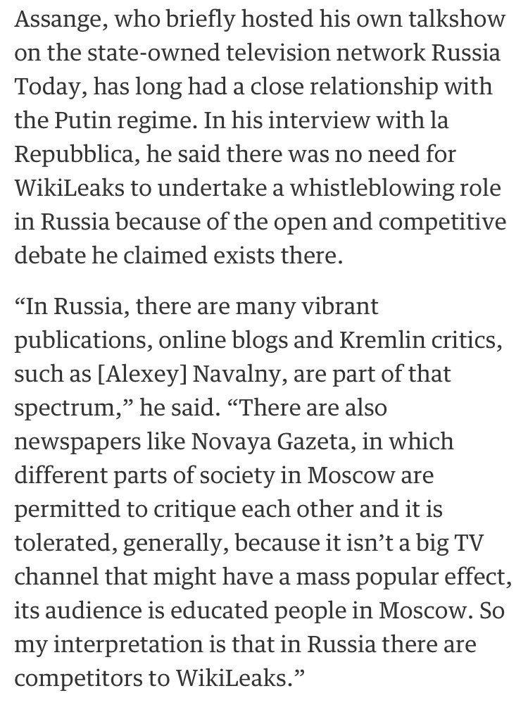 When asked about Wikileaks role as a whistleblower in Russia, Julian stated that Russia already has Kremlin critics such as Navalny and newspapers like Novaya Gazeta.