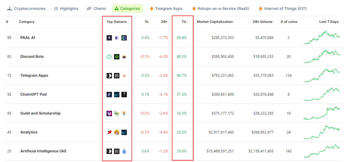 E.g. Currently AI-related coins are gaining momentum and several related categories are also leading in growth.