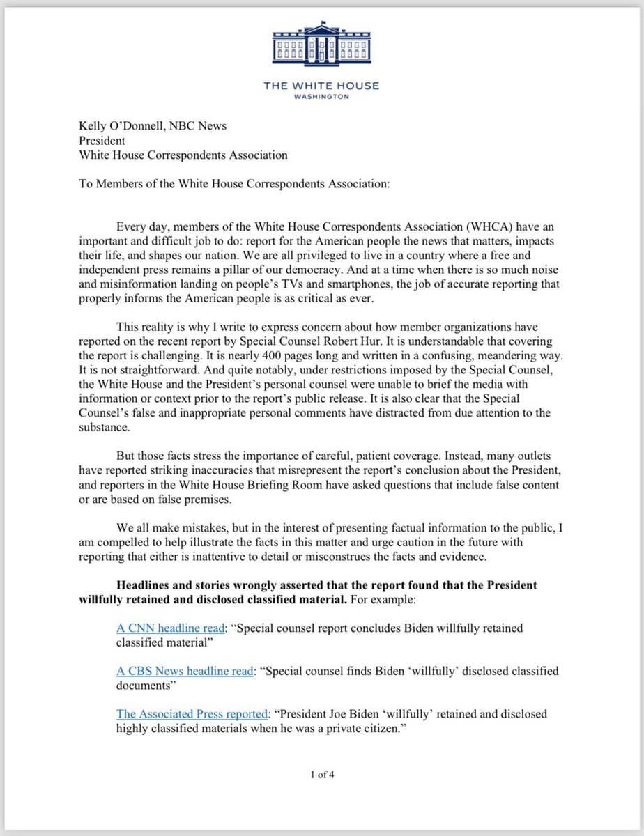 Page ONE: “Instead, many outlets have reported striking inaccuracies that misrepresent the report's conclusion about the President, and reporters…have asked questions that include false content/based on false premises…I am compelled to illustrate the facts & urge caution”