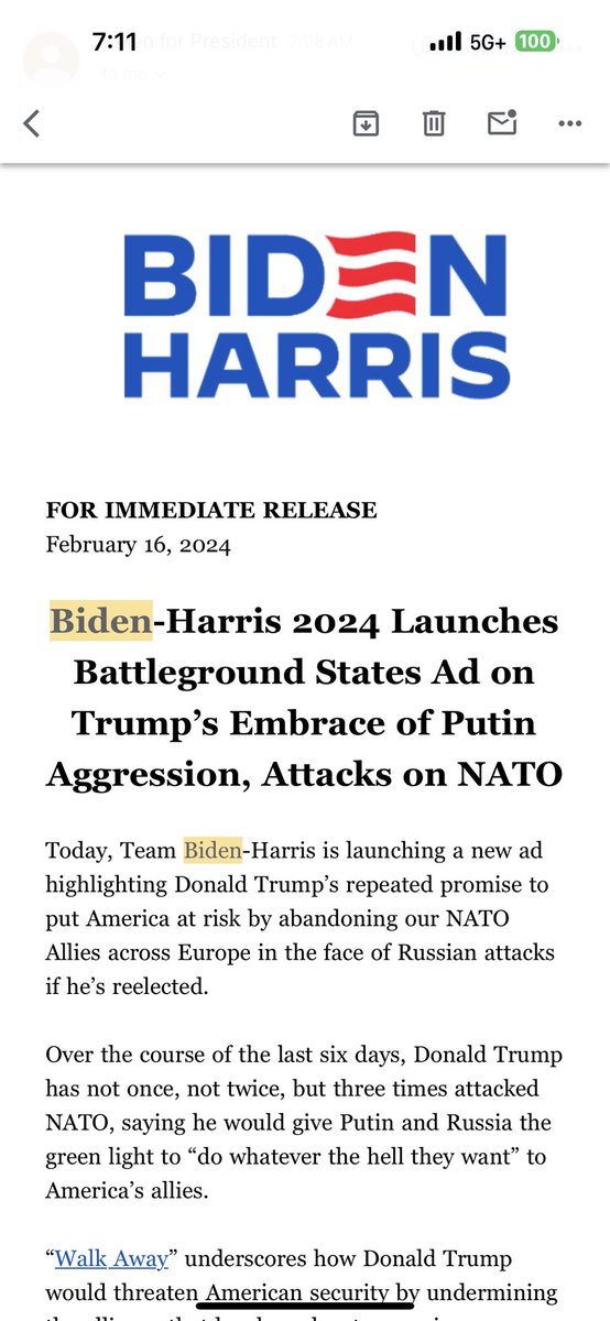 From the Biden campaign: “Today, Team Biden-Harris is launching a new ad highlighting Donald Trump’s repeated promise to put America at risk by abandoning our NATO Allies across Europe in the face of Russian attacks if he’s reelected.”