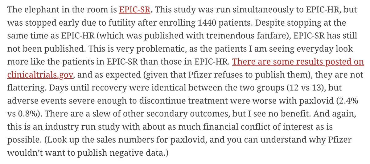 The other criticism is the high # of adverse events in the paxlovid group, some bad enough to cause participants to drop out.