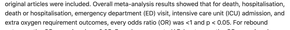 "Overall results showed that for death, hospital'n, death or hospital'n, ED visit, ICU admission, and extra oxygen requirement outcomes, every odds ratio (OR) was <1 and p < 0.05."