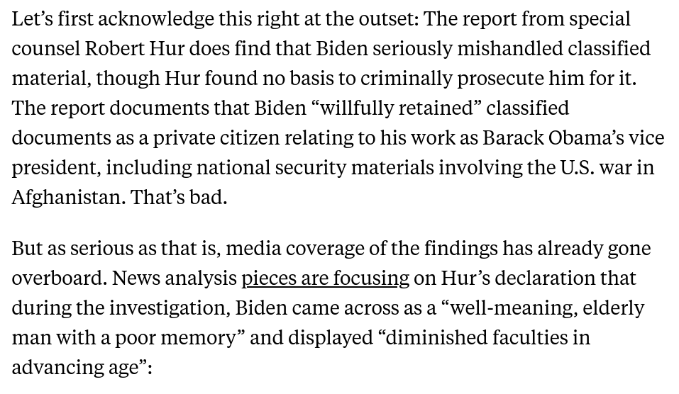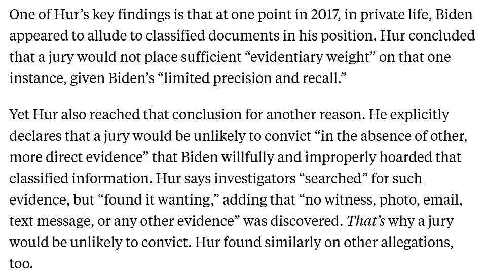 The GOP talking point that Biden isn't being prosecuted *because of* his dementia or whatever is staggeringly dishonest. The report explicitly says investigators *couldn't find sufficient evidence* to persuade a jury: