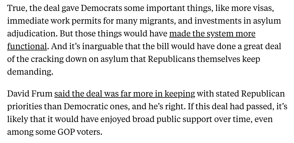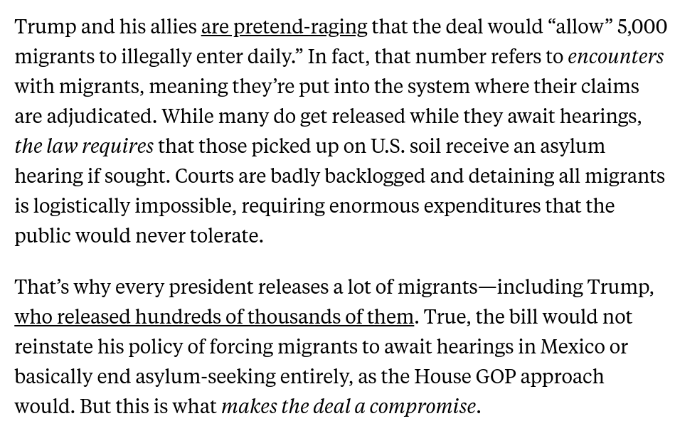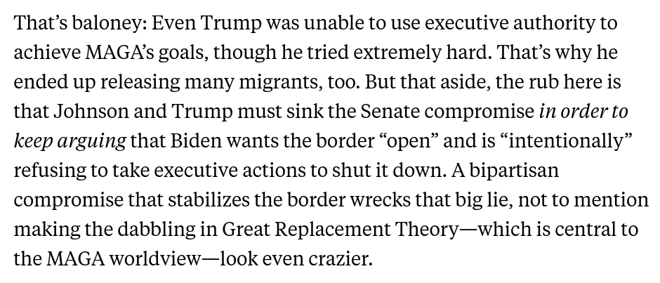 Trump and Mike Johnson both gave away the game: If Republicans help pass the deal, they will have participated in a solution for the border mess. They oppose it *precisely because* it does a fair amount of what Republicans say they want. 2/
