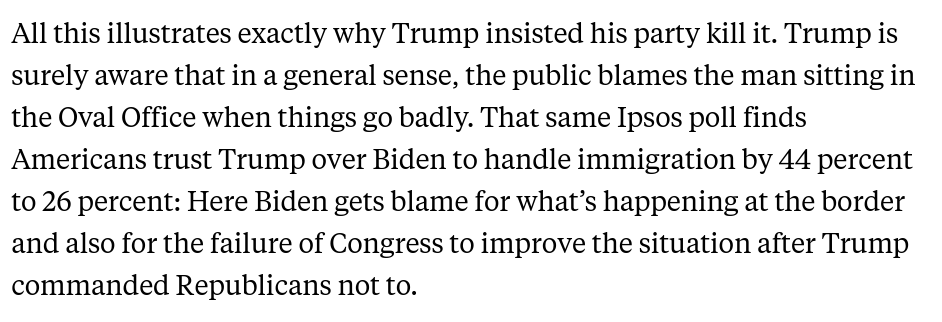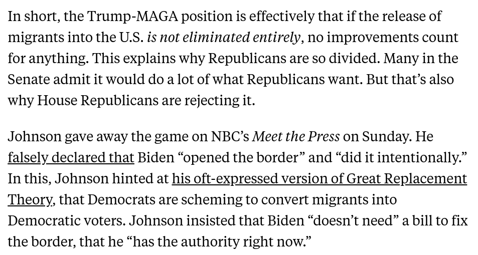 Trump and Mike Johnson are killing the House vote on the border deal because (1) they know it would pass; and (2) this would wreck their strategy of claiming Biden alone owns what happens at the border.