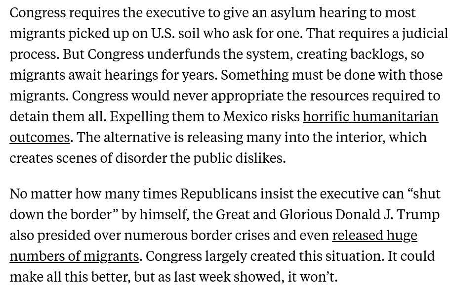 Trump/GOP know the sitting POTUS will get blamed when things go wrong. But this problem is particularly brutal on immigration: Congress has put the executive in an impossible position, and voters don't know this. I tried to explain how this works here. 3/