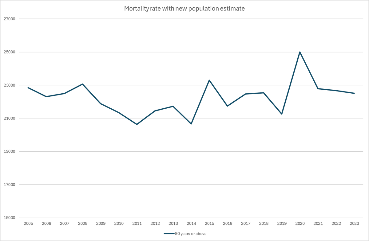 differences in trends between the sexes (deaths in men over 90 have been rapidly increasing thanks to survival)