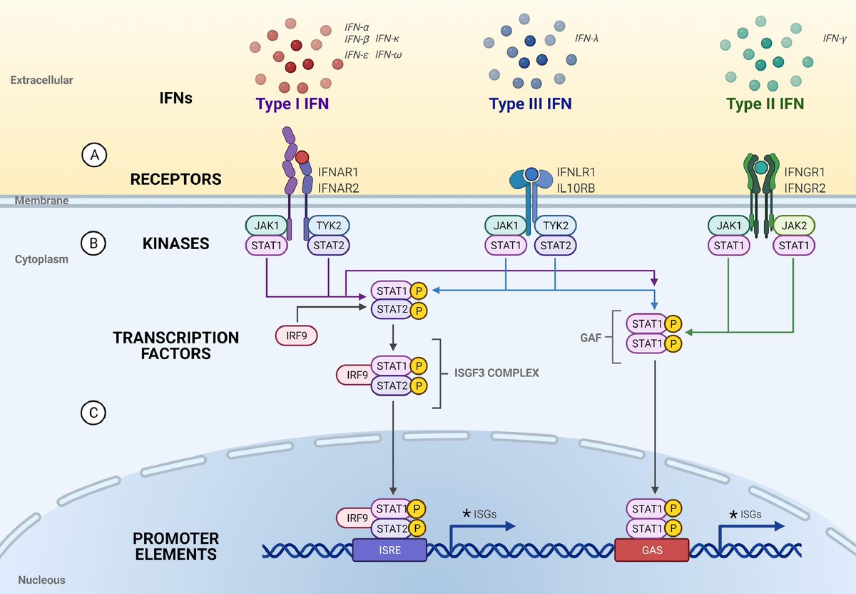 Interferons (IFNs) can play either protective or detrimental roles in the context of viral infections. Exaggerated IFN signaling may result in excessive tissue damage, necrosis, and inflammation, which could contribute to enhanced pathology. 1/