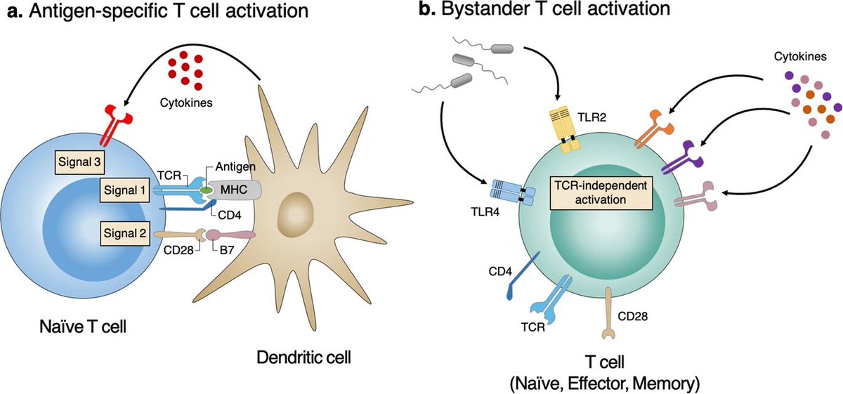 Although T cells are primarily activated in response to antigen recognition via their T cell receptor (TCR), they can also undergo TCR-independent “bystander” activation in response to certain cytokines. 7/
