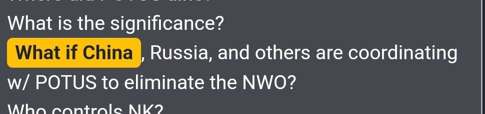2.) Global mitary operations to take out and deroot the NWO and corrupt central banking system. Think Trump's capitulation/world tour. Think Epstein. "What if China, Russia, and others are working with POTUS to take down the NWO"