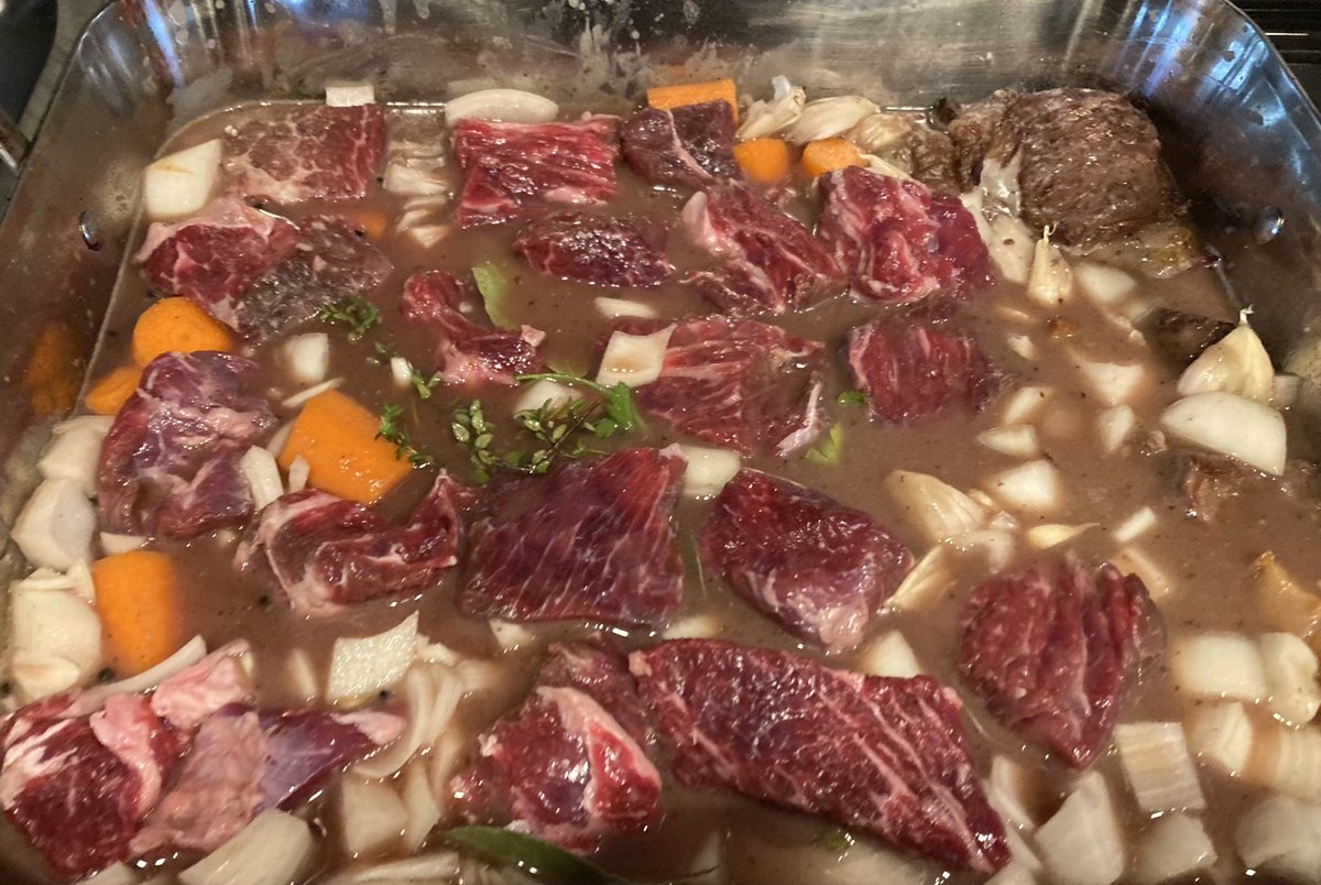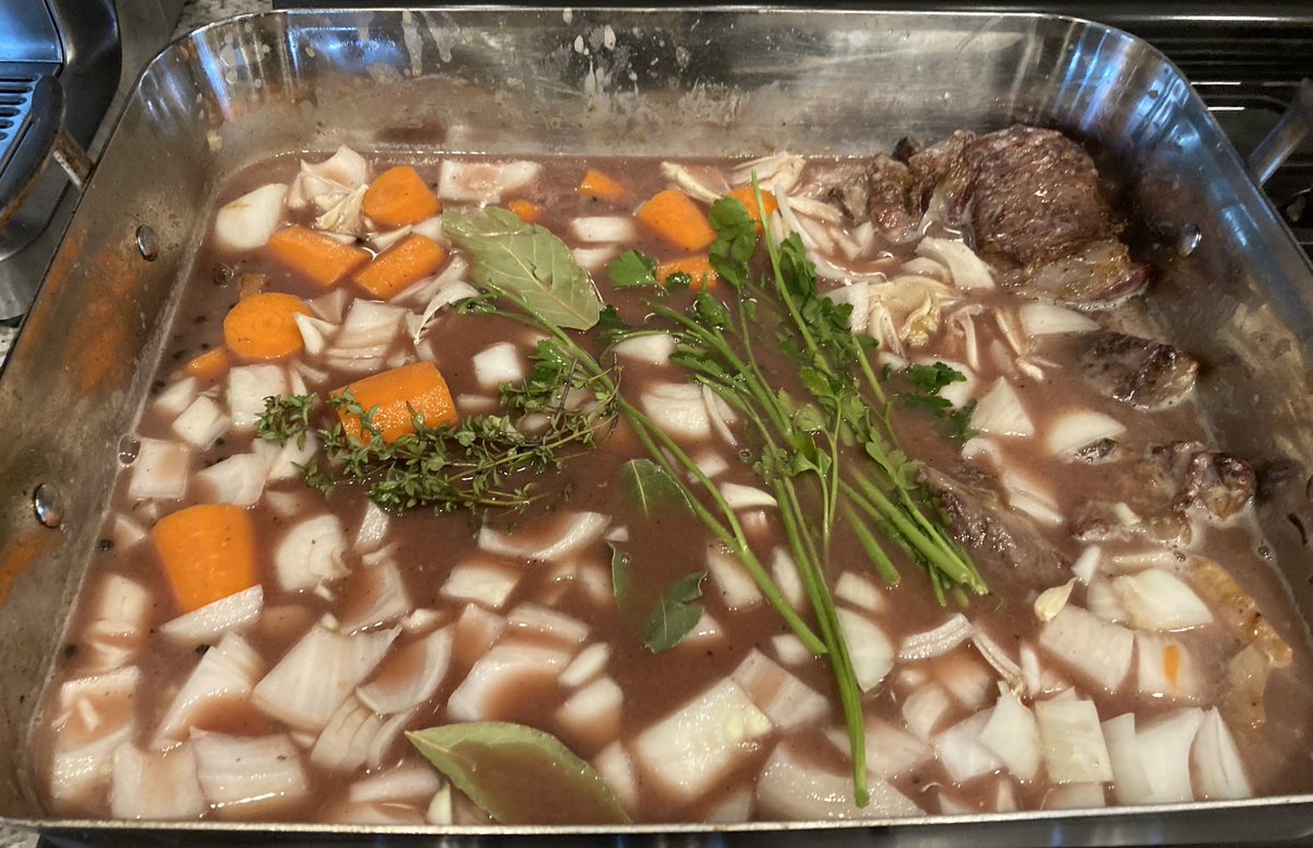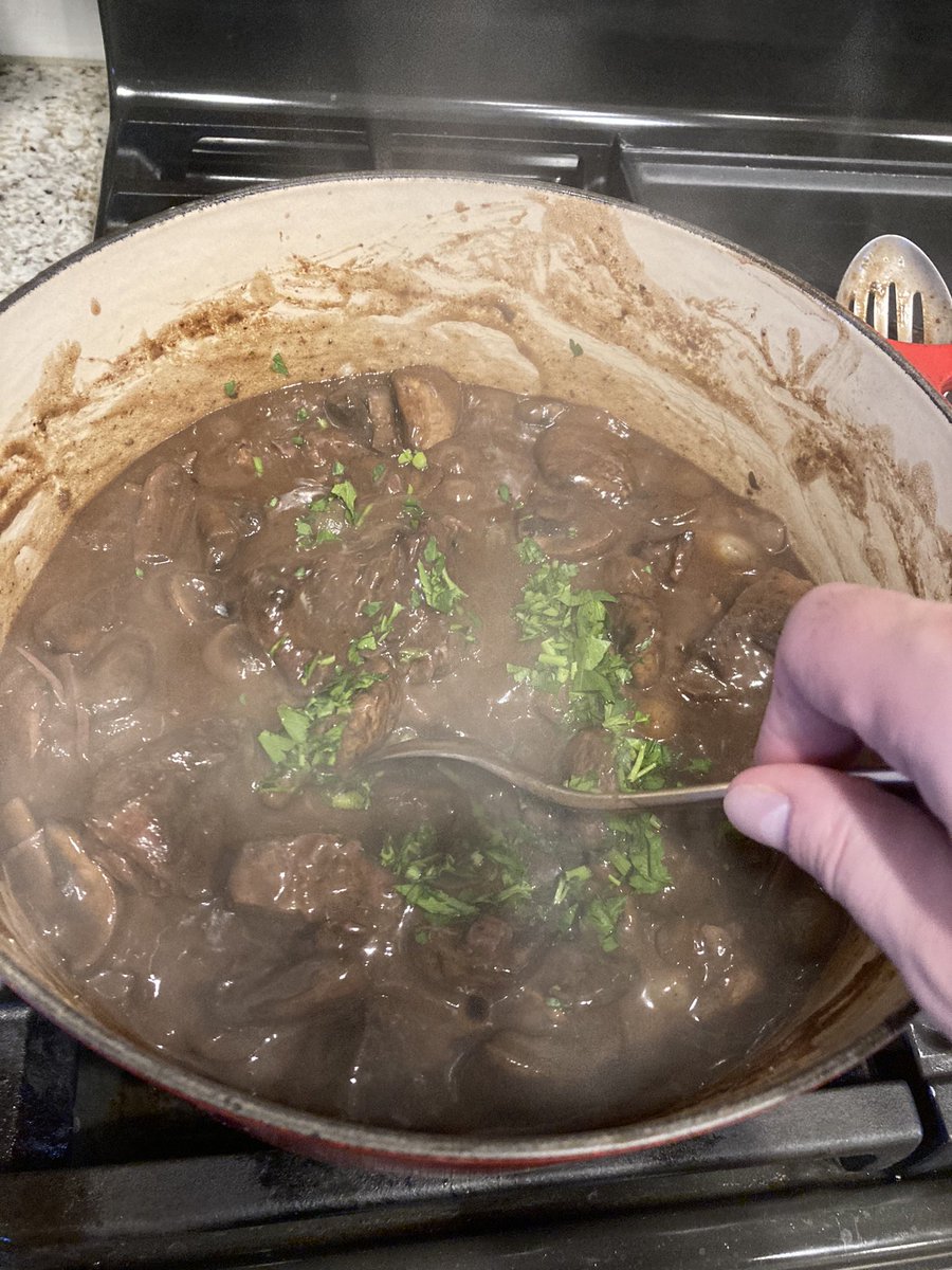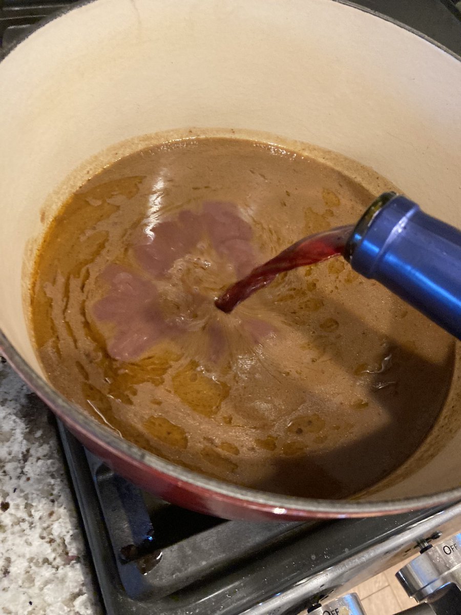 4/now add in about 2/3 bottle of red wine (if you have nice Burgundy great, I used a $12 bottle of California Pinot), 4 cups of beef stock. Parsley, onion, thyme, carrots, garlic. 1 tsp black peppercorns. 2 packets of gelatin. And your tomato/anchovy paste. Put this in oven at a reduced heat of 325 for 4 hours, mixing occasionally and checking how tender the beef is - when it’s very tender you’re done.