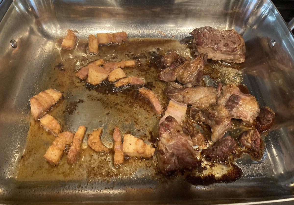3/you also need half a pound of salt pork cut into chunks. Place those in a roasting pan with the scraps of beef you don’t intend to use. Add in 2 tbsp butter, and roast for 15 minutes at 500 degrees. Then toss in 1/2 cup of flour and mix.