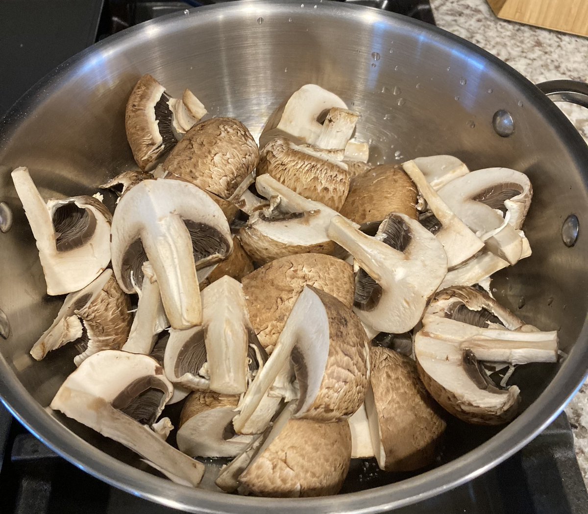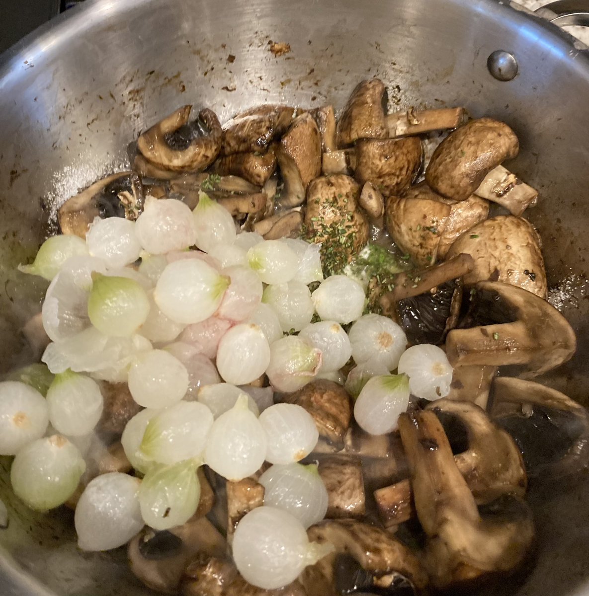 5/meanwhile do your mushrooms and pearl onions. What I do is use a saucier pan (curved sides make mixing easy) and add all my mushrooms (large creminis I quartered) with a little water. Put over medium heat till the mushrooms are cooked through and have released all moisture. Then I add the onions with 1 tbsp butter, about 1 tsp of chopped thyme and a splash of red wine. When liquid is absorbed and vegetables are glazed, pull and set aside.