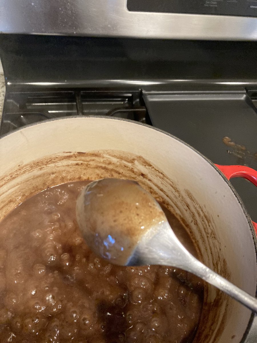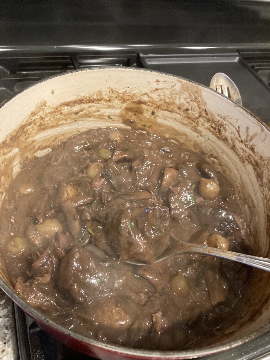 6/when your meat is done cooking, pull it and set aside with mushrooms and pearl onions. Then strain the liquid. Add it to a Dutch oven with the other 1/3 bottle of wine and boil down for a good 25 minutes. Till it’s thick and sticks to a spoon.
