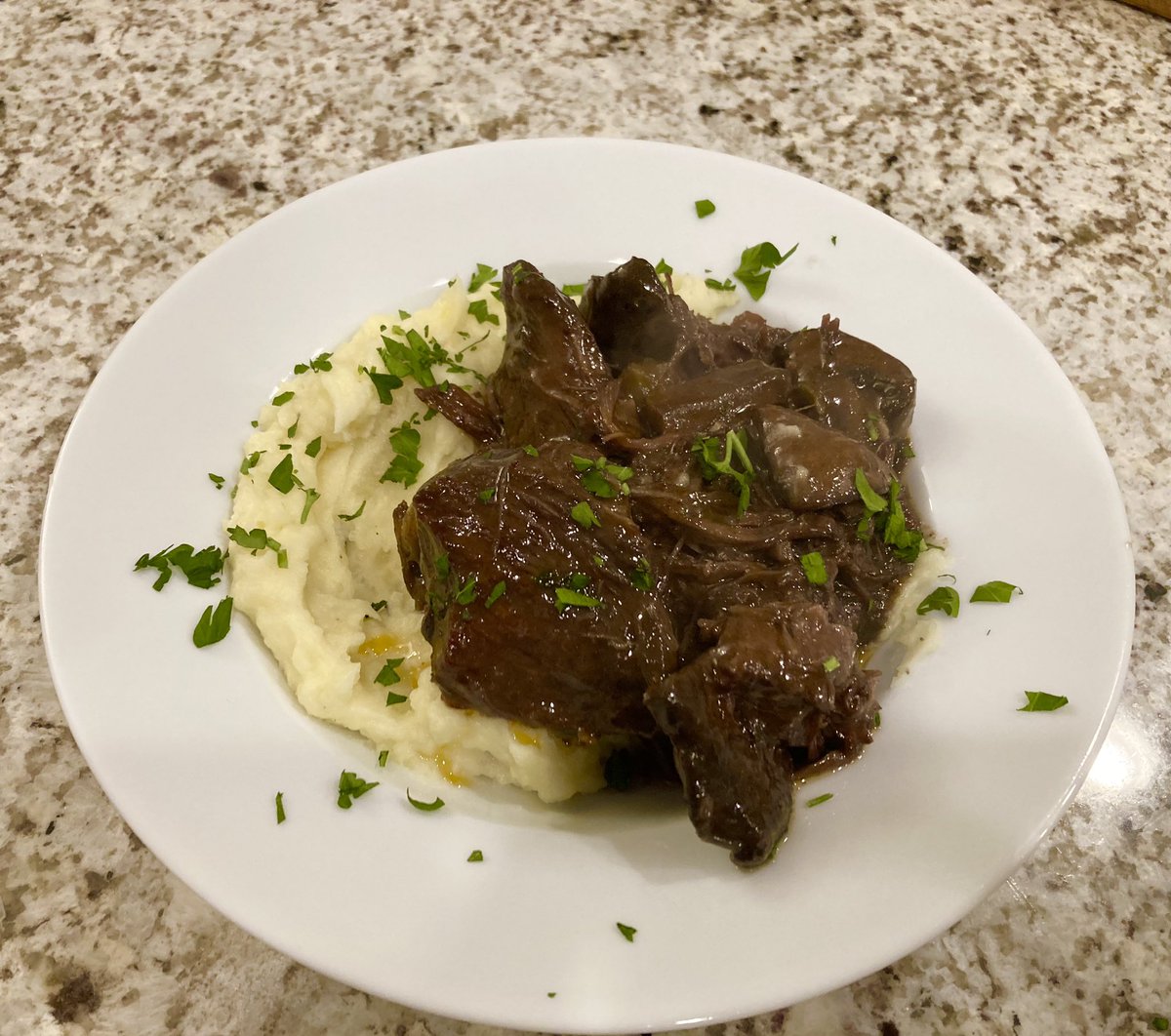 1/Ok so let’s do Beef Bourguinion, cash in my promise. This is the finished product served over simple mashed potatoes, garnished with parsley. Directions….