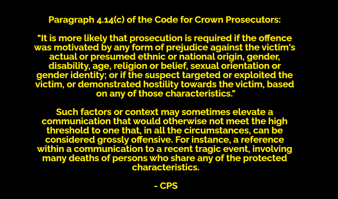 The CPS: “persons associated by their religious beliefs may also be part of a racial group”, & prosecutors should “consider on the facts of each case if the aggravating feature arises from hostility towards a religious belief or a racial group (or both)”. cps.gov.uk/legal-guidance…