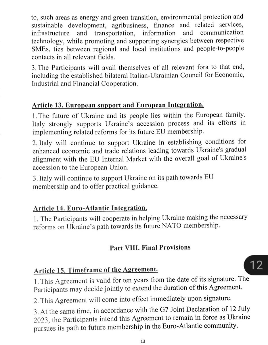 Gli impegni presi dal Paese politicamente sono enormi: il Preambolo fa propria per l'Italia la versione Euro-Atlantica del quadro per la "Pace" e adotta il Piano in 10 punti di Kiev, ossia, in pratica, guerra a oltranza fino alla resa di Mosca.→
