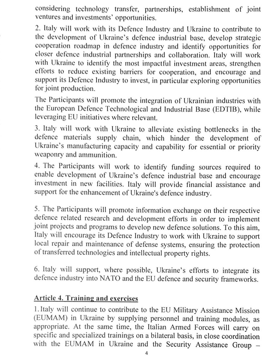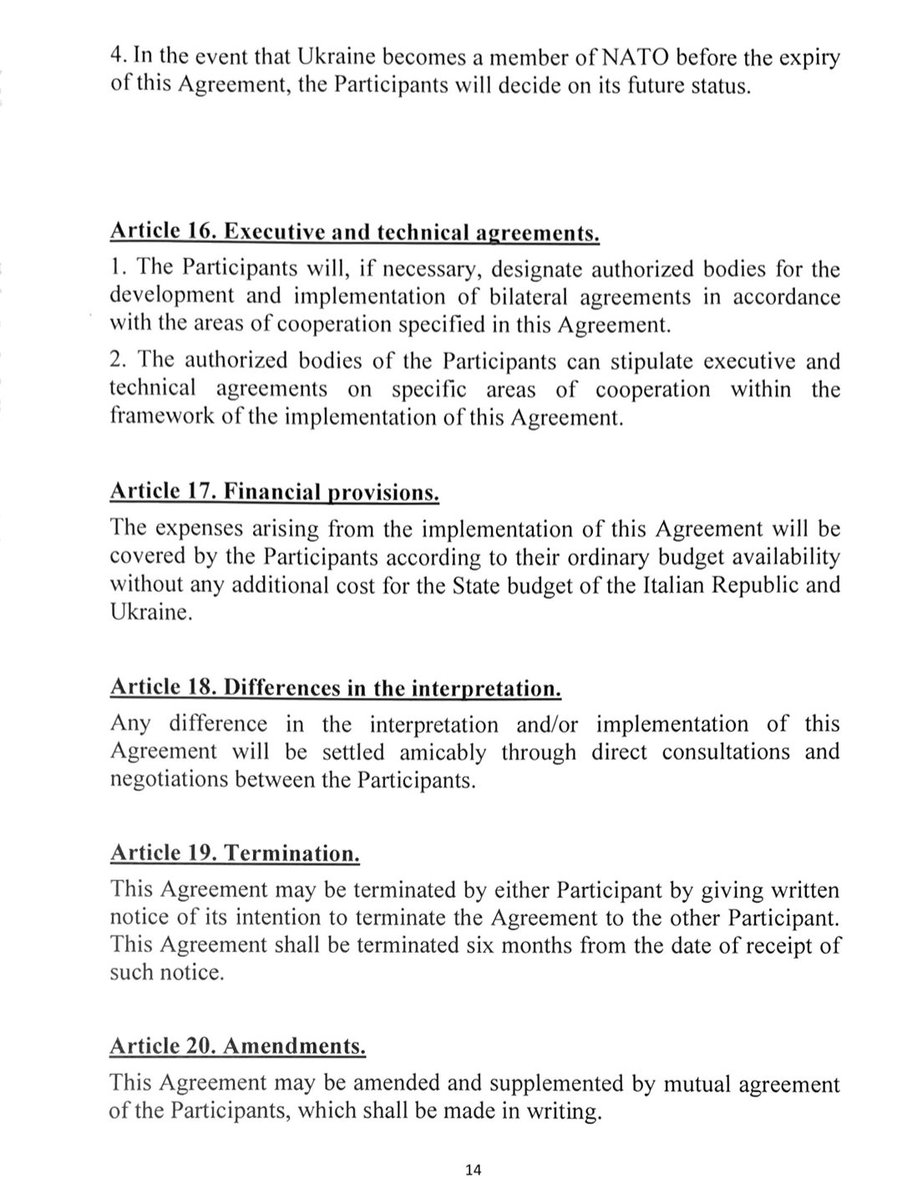 "duplice" copia riferendosi alle TRE versioni linguistiche dell'accordo, Italiano, Ucraino e Inglese (dichiarato come unico autentico), cita "Partecipanti", plurale, laddove si riferisce ad un solo soggetto "fornitore", l'Italia, quasi come se il testo fosse un adattamento →