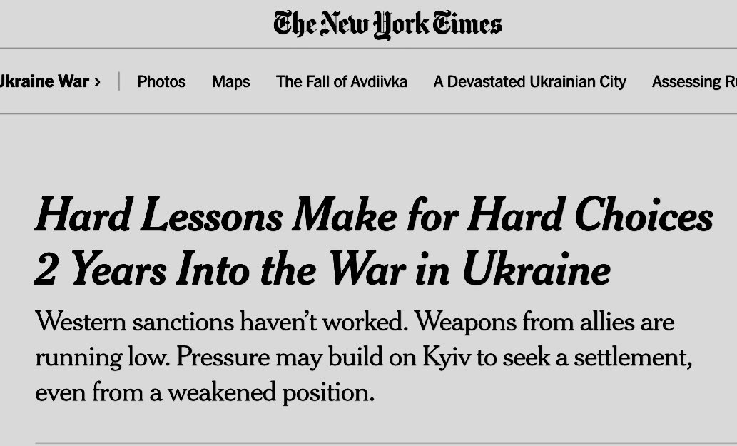 On the second anniversary of the Russian invasion, NYTimes writes that Western sanctions haven't worked, weapons from allies are running low, and pressure may build on Kyiv to seek a settlement.