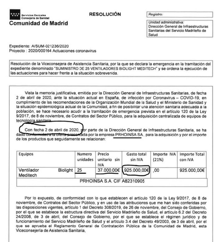 En este caso la empresa PRHOINSA propiedad de la familia de la exmujer de Tomás Díaz Ayuso también consiguió un contrato a dedo por 925.000 euros por la venta de 25 respiradores el 2 de abril de 2020.