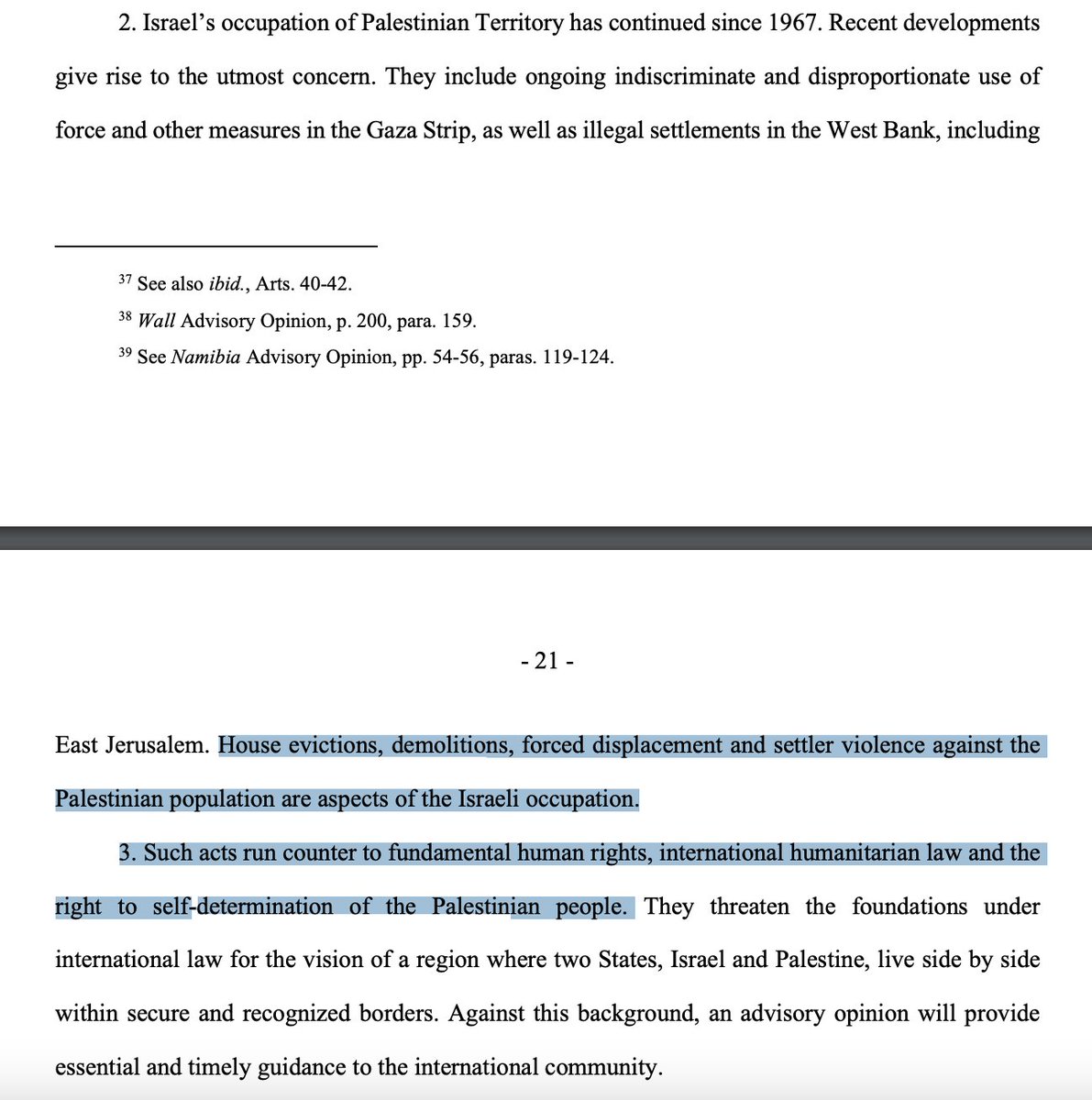 Het betreft een dubbele vraag van de VN @CIJ_ICJ: schendt de bezetting het internationaal recht en - als dat zo is - wat zijn de gevolgen van die schending?