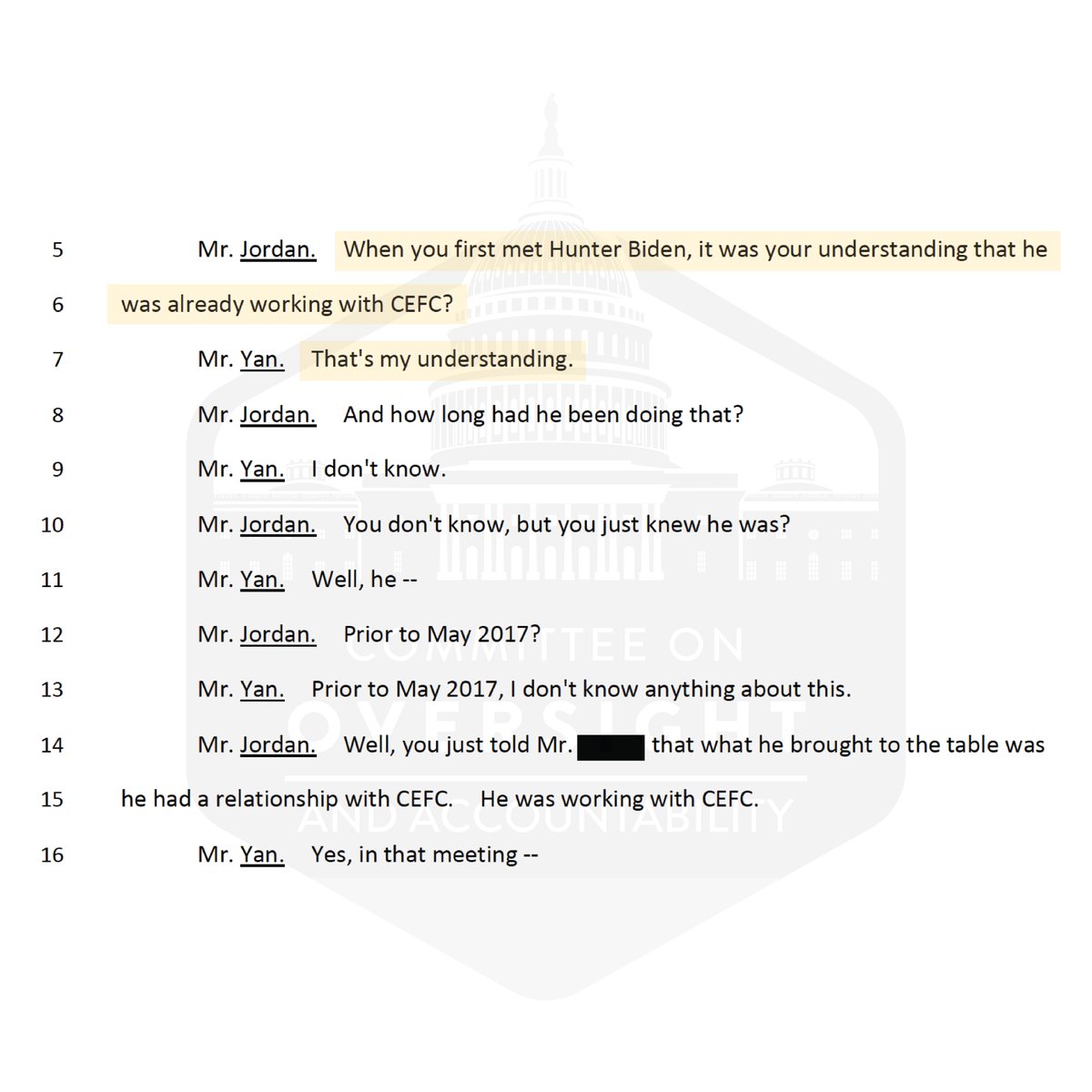 Today, we are releasing the transcript for Mervyn Yan, a Biden family associate connected to the Bidens’ dealings with the Chinese government linked energy firm, CEFC.