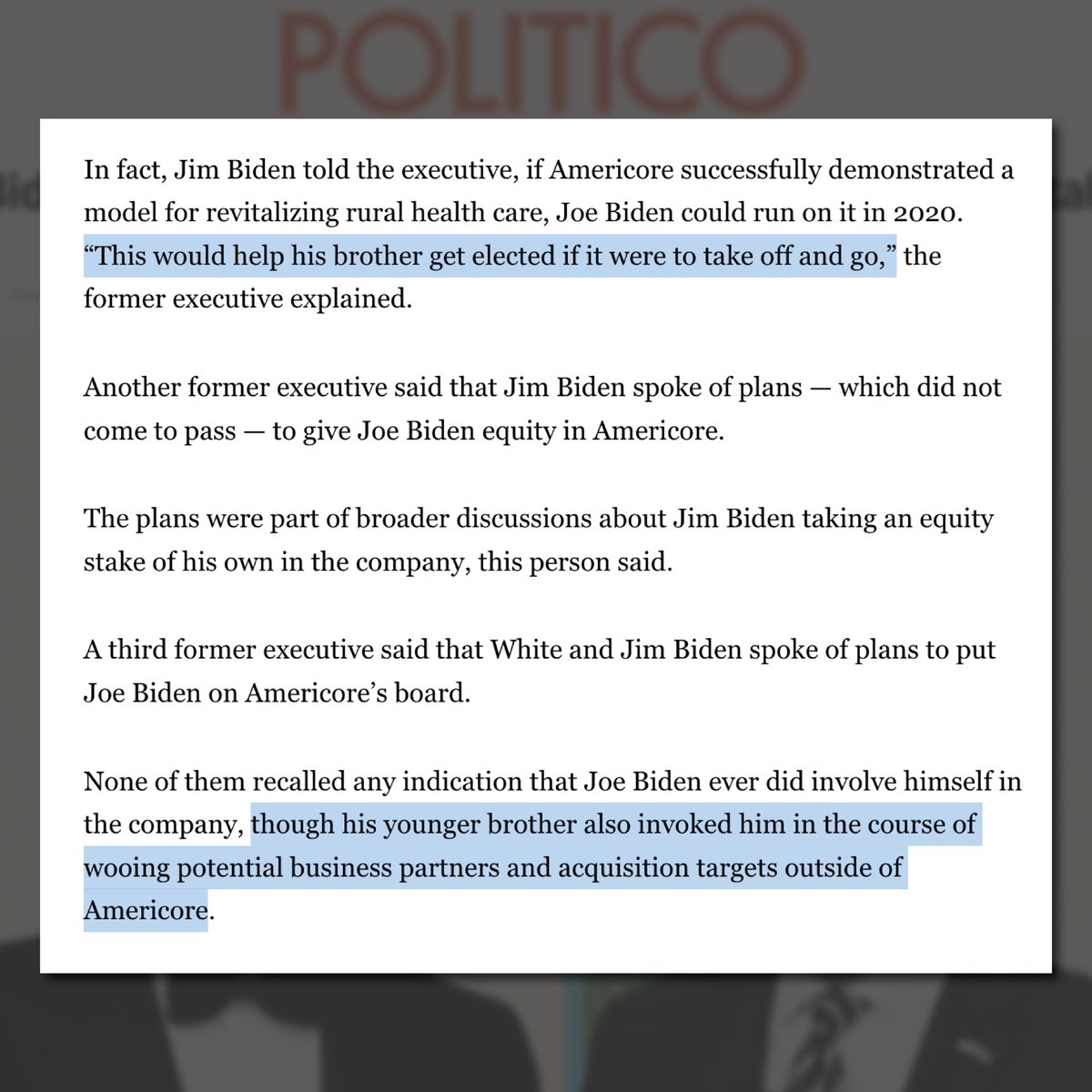 This weekend, POLITICO released a bombshell report on the Bidens’ interactions with Americore, a financially distressed rural hospital operator.
