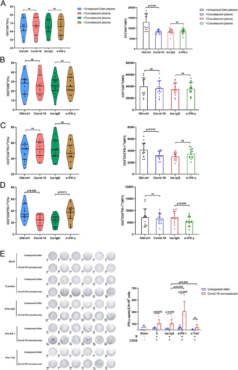 IFN-γ in the plasma of COVID-19 convalescent patients was increased, which inhibited PD-1 expression in CD8+ T cells from COVID-19 convalescent patients. 3/
