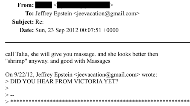 While most of the Epstein Files emails that use the word “shrimp” appear to refer to the seafood, some appear not to. Someone whose name is redacted emails Epstein to say, “Call Talia, she will give you massage. And she looks better then ‘shrimp’ anyway. And good with Massages.” The person is using shrimp in the context of “massage” which in many emails appears to refer to massage with sex...