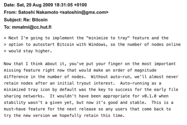 Satoshi: 'We need a feature for node retention. People will try it once and leave.' - credit goes to @marttimalmi for coming up with this auto-run concept in Windows. 9/44