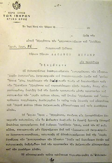 On April 13 1941, the holy bishopric of Mount Athos sent a letter to Germany, addressed to Hitler. They asked him to take the Athonite peninsula under his "high protection and guardianship." Also, they asked God to grant Hitler "health and longevity."