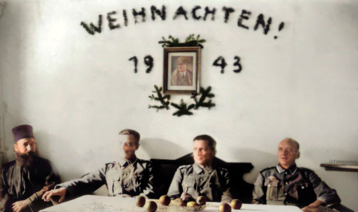 Christmas 1943, German soldiers sit under the portrait of Hitler in a monastery in Mount Athos.