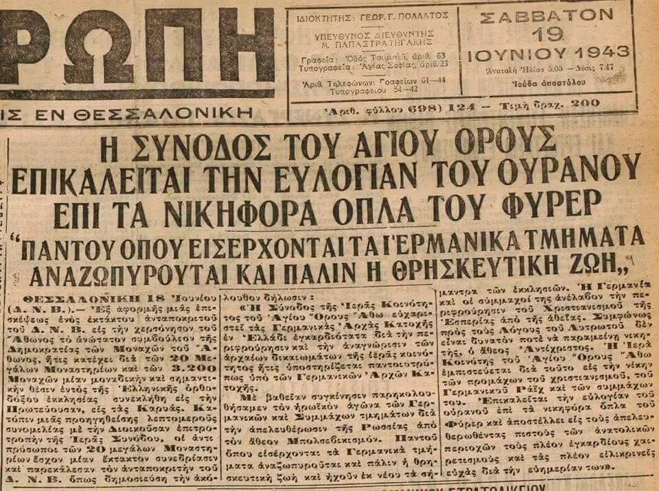 "The synod of Mount Athos invokes the blessing of heaven upon the victorious arms of the Führer. Wherever the German divisions enter, religious life is reborn again."