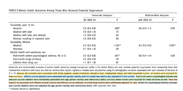In his study on puberty blockers’ effect on suicidality, Turban used the exact method he is accusing the Finnish researchers of using. If a variable was associated with suicidality, he controlled for it in the model. This included family support, employment, income, relationships, and even gender identity. /13